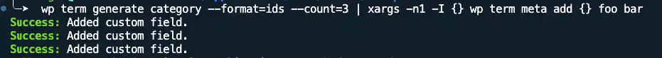 wp term generate category --format=ids --count=3 | xargs -n1 -I {} wp term meta add {} foo bar