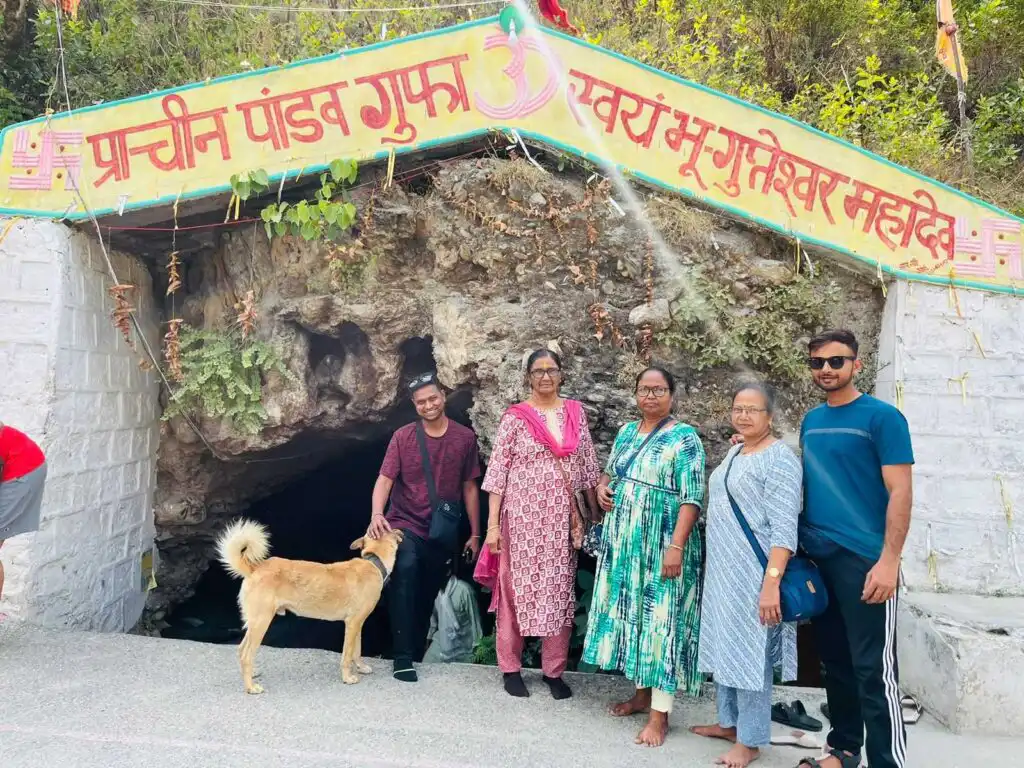 Here is a photo of us who went to Char Dham ( from left Me ( always with an animal), elder Masi, Mummy, Masi, Brother )